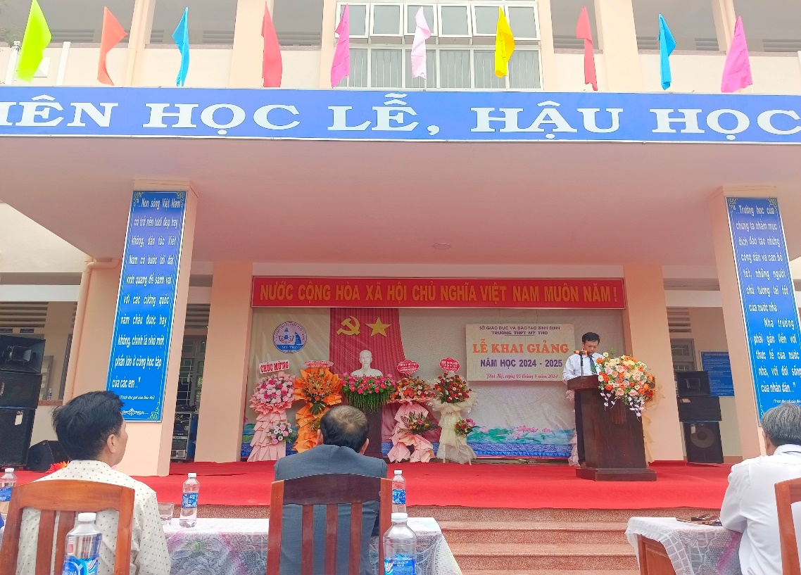 Tại buổi Khai giảng, thầy Phạm Tiến Vũ - Phó Bí thư Chi bộ, Phó Hiệu trưởng nhà trường đọc thư của Tổng Bí thư, Chủ tịch nước Tô Lâm; thư của Huyện ủy, Hội đồng Nhân dân, Ủy ban Nhân dân, Ủy ban Mặt trận Tổ quốc Việt Nam huyện Phù Mỹ gửi các thầy giáo, cô giáo, cán bộ quản lý, người lao động ngành giáo dục và đào tạo, các em học sinh, sinh viên và các bậc phụ huynh nhân dịp khai giảng năm học mới 2024 - 2025.
