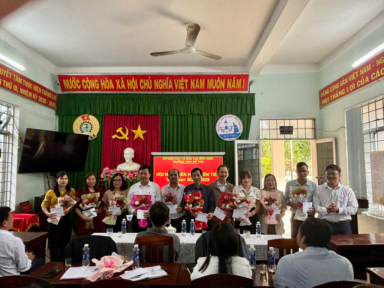 Nhằm tổng kết, đánh giá kết quả phong trào thi đua yêu nước trong nhà trường giai đoạn 2020 - 2025, ghi nhận những kết quả đạt được và chỉ ra những tồn tại, hạn chế cần khắc phục đồng thời xác định phương hướng, nhiệm vụ đẩy mạnh phong trào thi đua và nâng cao hiệu quả công tác khen thưởng giai đoạn 2025 - 2030. Chiều ngày 8/2/2025 Trường THPT Mỹ Thọ tổ chức Hội nghị điển hình tiên tiến giai đoạn 2020 - 2025. Tham dự hội nghị có Lãnh đạo nhà trường, Ban đại diện cha, mẹ học sinh và toàn thể giáo viên, nhân viên trong nhà trường.